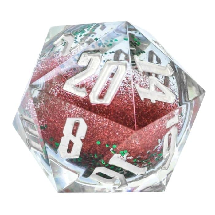 Cheer and whimsy rollls in with this sharped edged 54mm Snowglobe D20. Inside, snowflakes of red and green tumble amidst silver glitter!