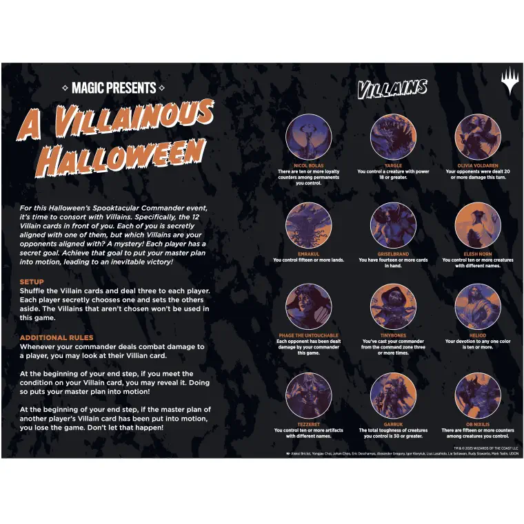 Magic Presents: A Villainous Halloween is a special Commander event offering a unique twist on the popular Magic format. Players bring their own Commander decks and, at the start of the game, secretly choose a villain card, each representing a classic villain from Magic’s history with its own alternate win condition.