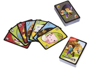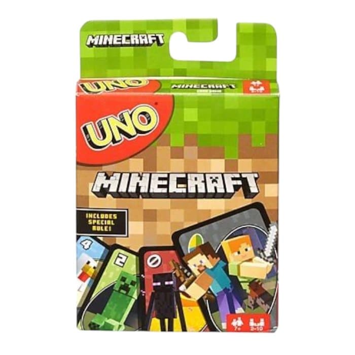 Ben jij ook zo’n fan van Minecraft? Dan zit je goed met deze Minecraft-editie van UNO! De kaarten en afbeeldingen zijn geïnspireerd op de personages uit de game, terwijl de regels overeenkomen met het klassieke UNO-spel, waarbij spelers de bijpassende kleuren en cijfers moeten vinden om alle kaarten kwijt te raken. Ook is er een speciale Creeper-kaart. Als je deze trekt, moeten de andere spelers drie extra kaarten van de stapel pakken!. Heel belangrijk: als je nog maar één kaart in je hand hebt, moet je “UNO!” roepen.