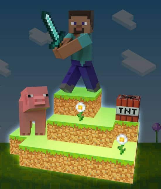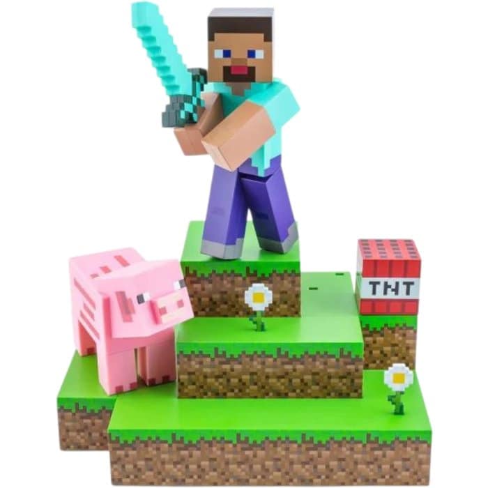 Build and craft to your heart’s content with this Minecraft Steve Diorama Light. The 30cm (11.8 inch) tall light includes removable and movable Steve and Pig figurines. The Earth block lights up and illuminates the figurine display – however you arrange it. Power the light with USB (cable included). Twist the TNT block to turn on the light and adjust the brightness. The Minecraft Steve Diorama Light is an awesome collectable piece that you will love just as much as you loving playing Minecraft!