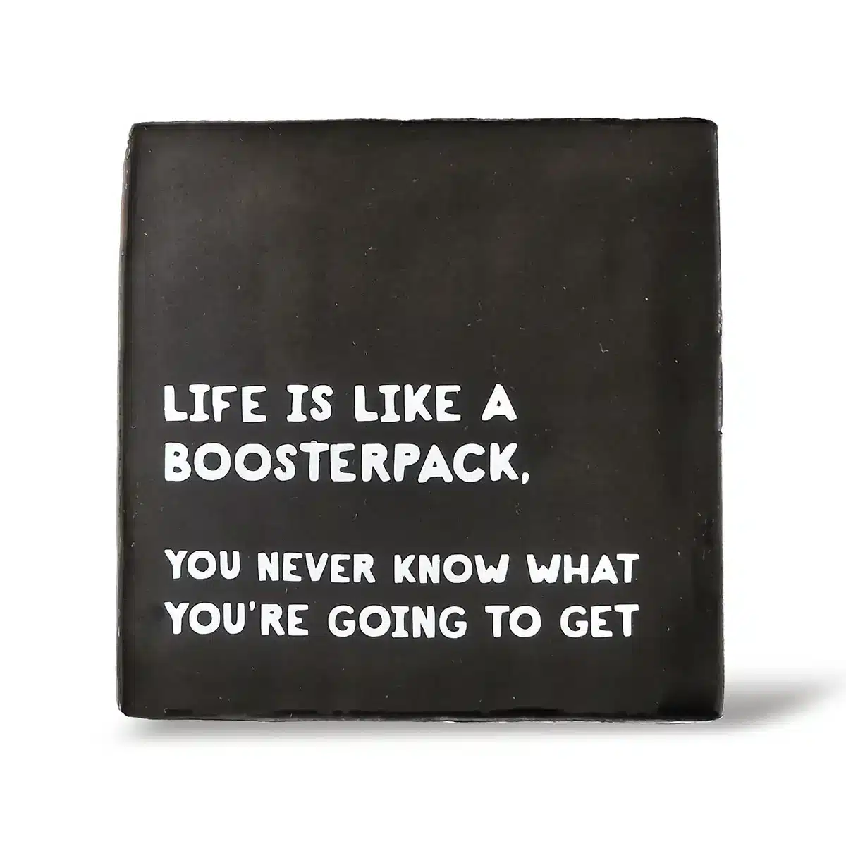 Handgemaakte tegel met tekst “Life is like a boosterpack”.