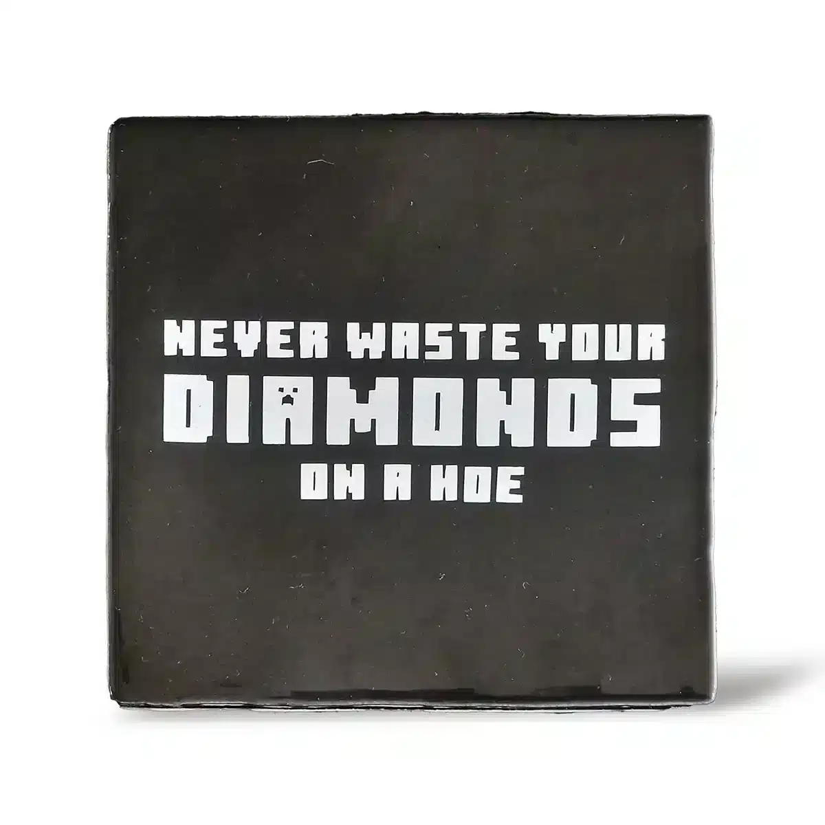 Handgemaakte tegel met tekst “Never Waste Your Diamonds On A Hoe”.