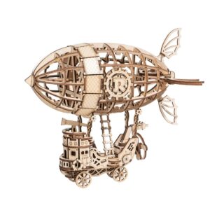 Vlieg er ’s in. Dit houten bouwpakket is werkelijk een prachtig kunstwerk dat een glimlach op ieders gezicht tovert. Dit steampunkachtige luchtschip is eigenlijk alles wat je maar kunt bedenken. Hoewel het slechts een statisch model is, zou het in werkelijkheid kunnen vliegen dankzij de zeppelin, rijden met de wielen en drijven door de boot. De zeppelin heeft fantastische vinnen die lijken op die van een vis en let op, je kunt een trapje af! Voor meer bijzondere details lees je snel verder.