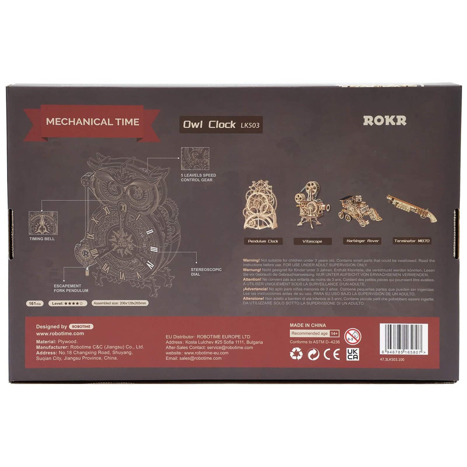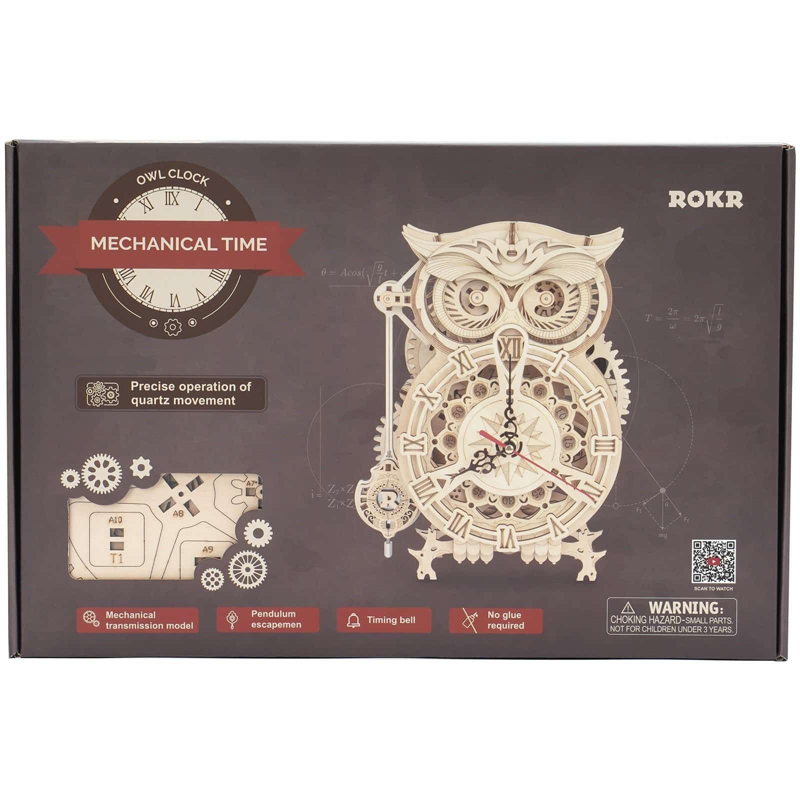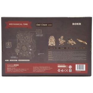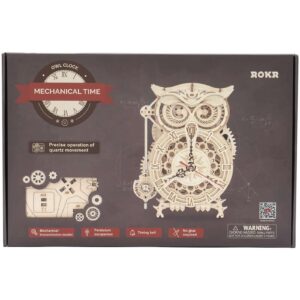 In een uur of vier knutselen volwassenen de 161 onderdelen van deze houten modelbouw in elkaar. Dit bouwpakket van hout van ROKR met zijn romeinse cijfers op de wijzerplaat heeft een prachtige windroos, waardoor het een plaatje is als decoratie. De grote wenkbrauwen doen denken aan de oehoe, ’s werelds grootste uil die driekwart meter groot wordt. Jouw ROKR bouwpakket wordt bijna dertig centimeter hoog.