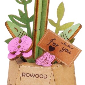 Zeg het met bloemen, maar dan nét even anders! Deze charmante vlinderorchidee van Rowood is een echte blikvanger met haar vijf sierlijke paarse bloemen, elegant staand in een stijlvol vaasje. De groene stelen en houten bloembladeren geven een warme, natuurlijke uitstraling, terwijl het kartonnen vaasje subtiel versierd is met schattige insectenillustraties. Een klein kaartje met de tekst “For You” maakt dit houten boeket helemaal af. Romantisch, speels en kunstzinnig tegelijk, perfect om je bureau, kast of vensterbank op te fleuren of om iemand anders een stralende dag te bezorgen. Deze orchidee is niet alleen decoratie, het is een beleving.