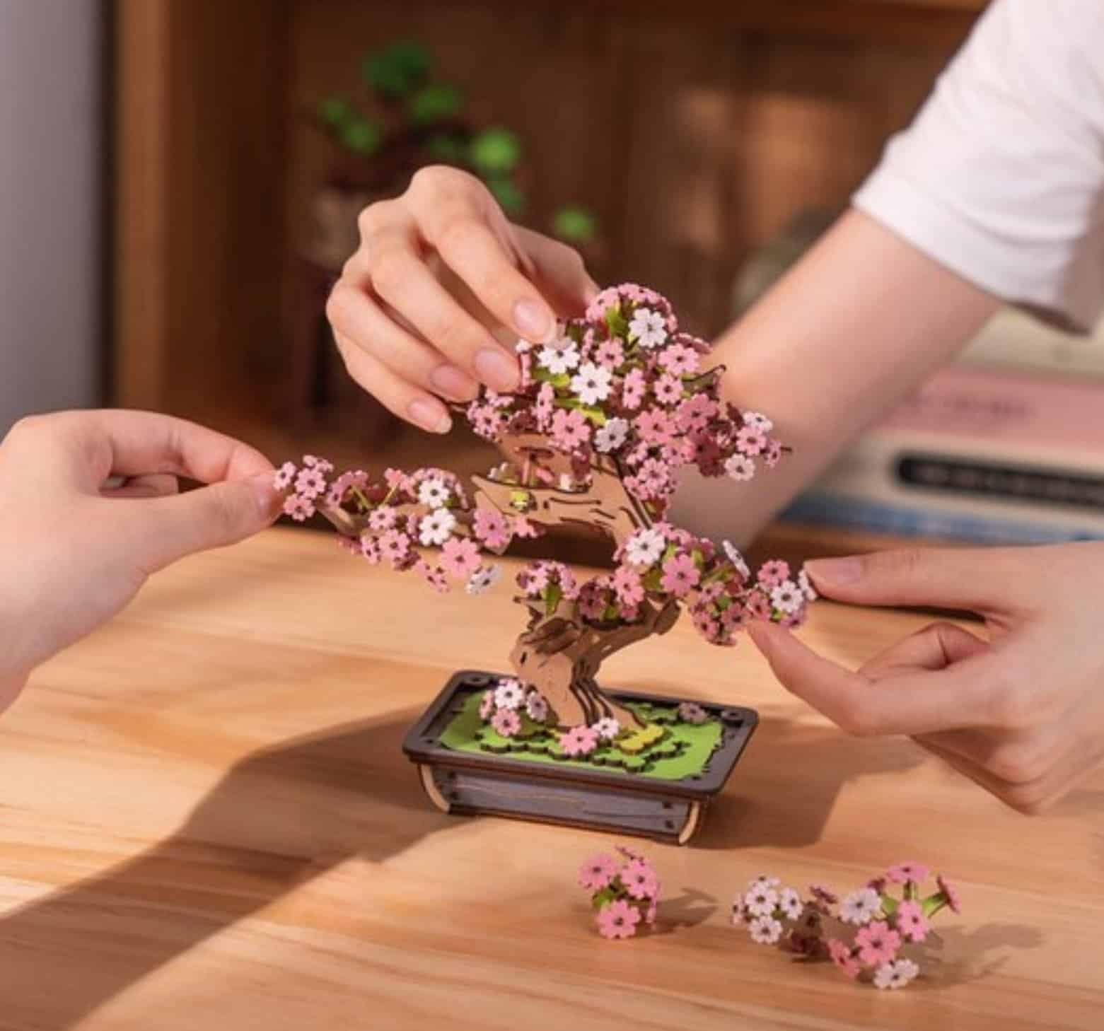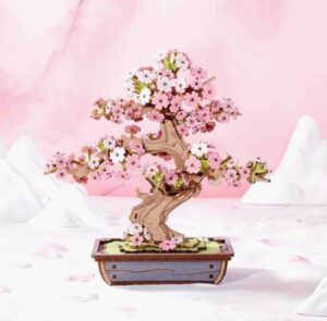 Wat grappig! Een miniatuurlandschap in een miniatuur houten bouwpakket! Bonsai betekent landscaping in het Chinees en begon in China ver voor Christus. Bonsai staat bekend om eeuwenoude boompjes met een doorleefde look, zorgvuldig gevormd in een typerend bakje. Dit houten bouwpakket voor volwassenen laat je zelf zo’n prachtig miniatuurlandschap creëren! Groene blaadjes frissen het geheel op, terwijl de roze en lichtroze kersenbloesem ofwel sakura, de uitbundige bloei van de Japanse lentetraditie weerspiegelt. Een leuke creatieve manier om de eeuwenoude bonsaikunst in huis te halen!