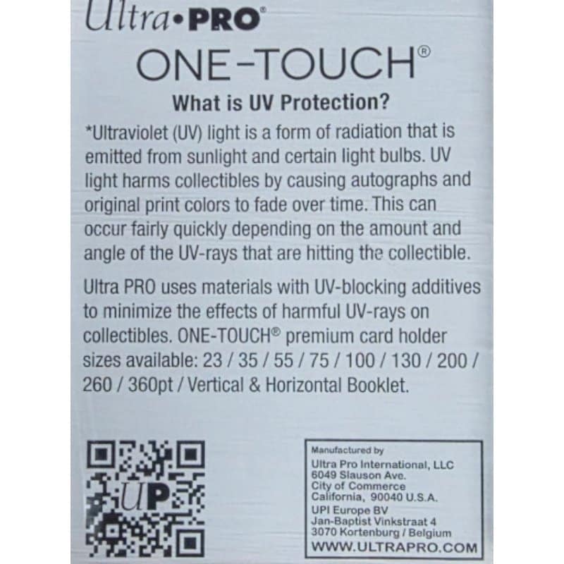 Ultra PRO ONE-TOUCH kaarthouders zijn premium acryl cases voor het bewaren van ruilkaarten, ontworpen om de ultieme bestemming voor je Trading Cards te zijn. De tweedelige ONE-TOUCH etuis zijn uniek ontworpen met schuivende scharnieren en een magnetische sluiting, zodat je nooit meer een schroevendraaier hoeft te gebruiken. De houder maakt gebruik van UV-blokkerende additieven om je kaart te beschermen tegen schadelijke UV-stralen en is gemaakt van niet-pvc-materialen om zuurvrije bescherming te bieden – zodat je kostbare kaart zijn conditie behoudt terwijl hij wordt tentoongesteld. Onze ONE-TOUCH houders zijn ook ideaal voor het tentoonstellen van waardevolle en zeer zeldzame speelkaarten. In dit model passen standaardkaarten met een dikte tot maximaal 35pt.