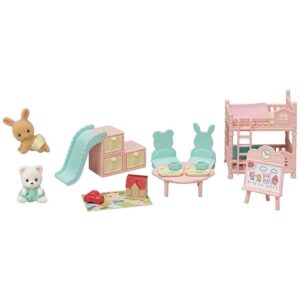 Deze charmante babyslaapkamerset biedt een leuke en kleurrijke omgeving voor je Sylvanian-baby’s om in te rusten en te spelen. Er is een opslagruimte met ingebouwde glijbaan, tafel en stoelen voor de maaltijden en een set stapelbedden voor baby’s met een cool huisdesign!