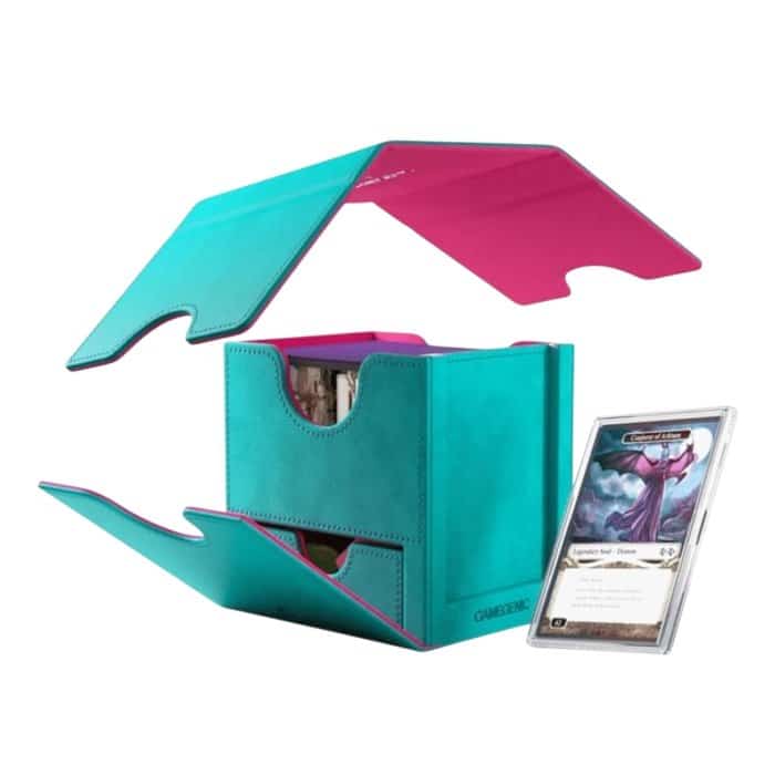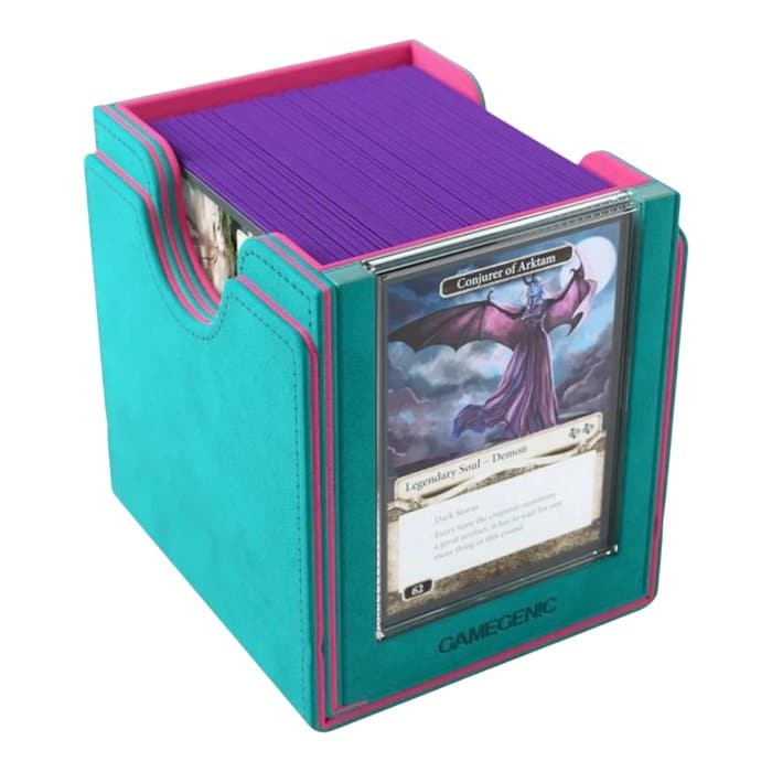 With room for 100 double-sleeved cards in extra thick inner sleeves, or 100 regular double-sleeved cards plus tokens, this deck box combines storage with smart design. The convertible system lets the lid clip neatly to the bottom, keeping your table clutter-free during play.