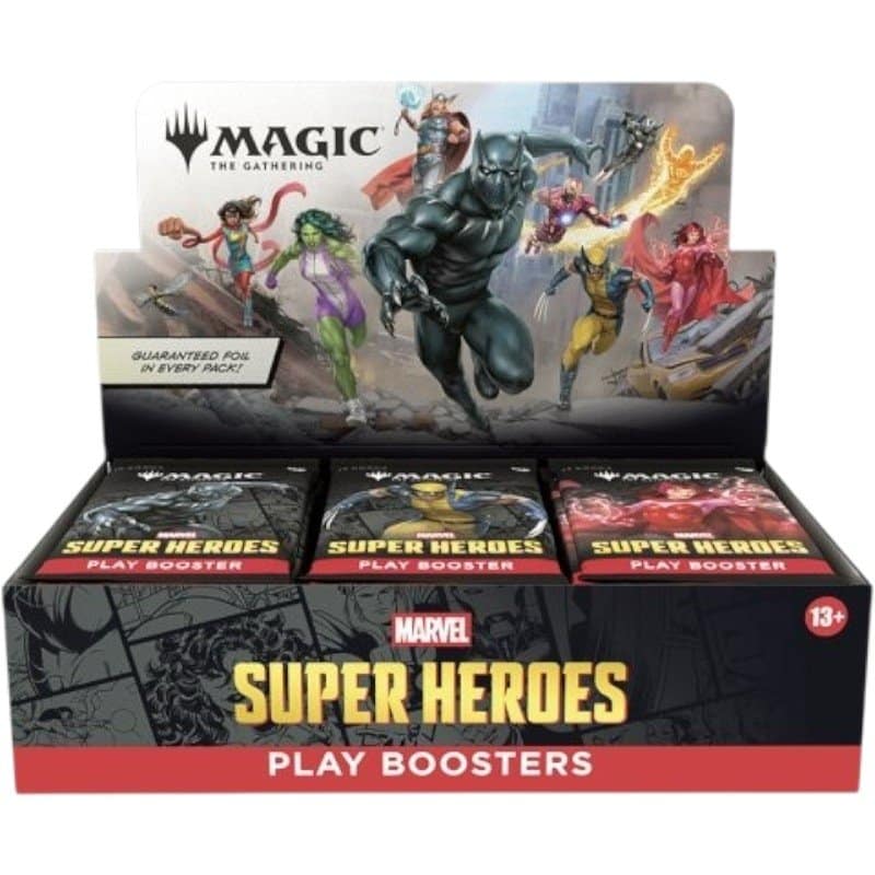 Een Play Boosterbox van Marvel Super Heroes bevat 30 Marvel Super Heroes Play Boosters. Elke Play Booster bevat 14 Magic: The Gathering kaarten van Marvel Super Heroes. De samenstelling van een play booster ziet er als volgt uit: