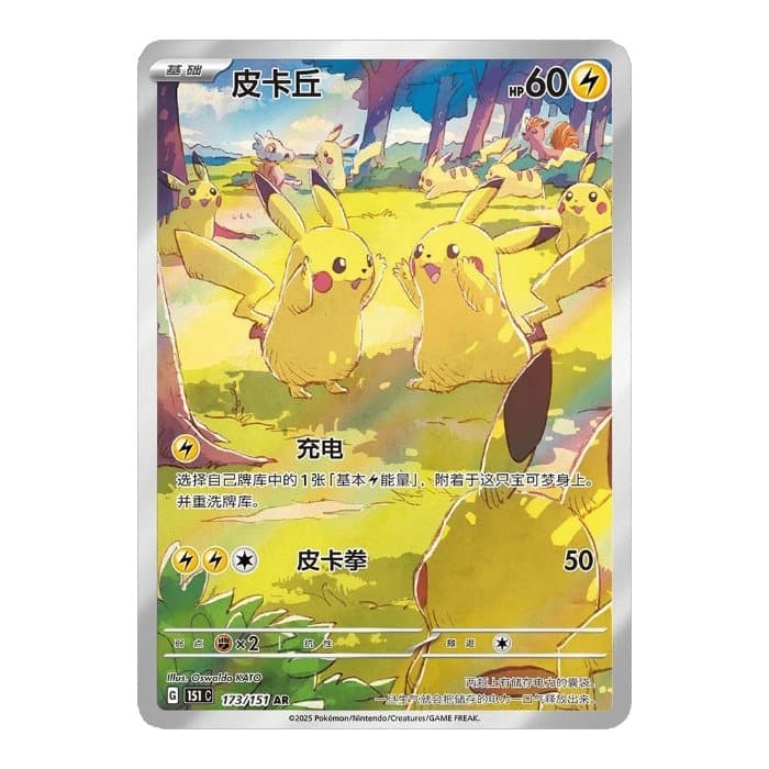 De meest gewilde kaart in deze set is de Pikachu AR 173/151, een exclusieve Art Rare Pikachu kaart die alleen beschikbaar is in deze Chinese set. Deze kaart toont meerdere Pikachu in een betoverend landschap, geïllustreerd door Oswaldo Kato. Gezien de beperkte oplage en het unieke ontwerp is deze kaart bijzonder waardevol voor verzamelaars. Pull jij deze kaart?