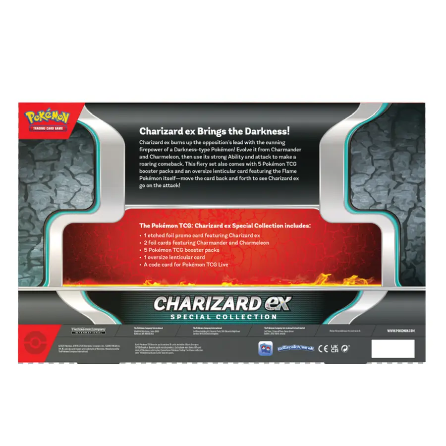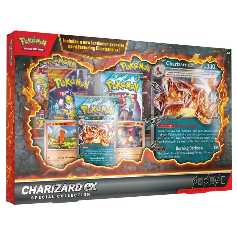 Charizard EX verbrandt de tegenstander met de vurige kracht van een Darkness-type Pokémon! Laat hem evolueren vanuit Charmander en Charmeleon, en gebruik vervolgens zijn sterke Ability en aanvallen om een verwoestende comeback te maken. Deze vurige set bevat ook 5 Pokémon TCG booster packs en een oversized met de populaire Charizard — beweeg de kaart heen en weer om Charizard EX in actie te zien gaan!