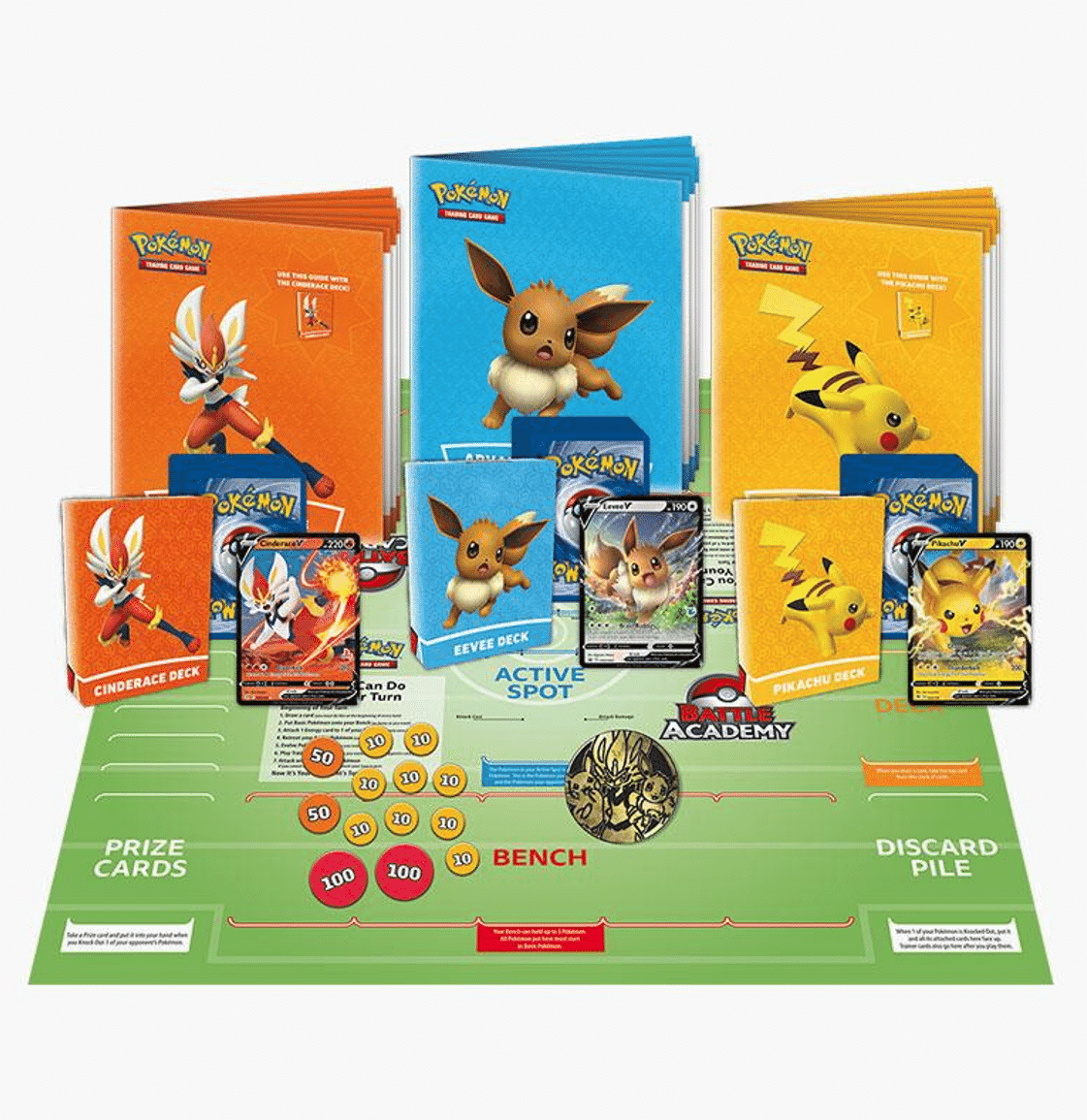 Houd jouw ruilkaarten in de aanslag en bereid je voor op het ultieme Pokémon gevecht met deze coole Pokémon Trading Card Game Battle Academy! De Battle Academy bevat alles wat twee spelers nodig hebben om te spelen. Je kunt direct aan de slag met regelboekjes voor de decks, zodat je eerste game gemakkelijk te leren is. Je kunt Cinderace of Pikachu kiezen om je team te leiden in een direct gevecht tegen een andere Trainer. Verwissel dan de decks om Eevee tegen Cinderace of Pikachu te spelen en leid een ander team Pokémon de arena in. Met een beetje strategie en een beetje geluk word jij de absolute kampioen!