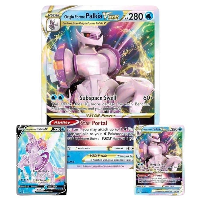Origin Forme Palkia VSTAR zweeft door de lucht en verstoort de structuur van de ruimte zelf om je team te versterken! In deze box krijg je deze oude legendarische Pokémon, zowel als gewoon kaart als als groot jumbo-kaart. Palkia heeft een unieke VSTAR Power die je toestaat om gedumpte energie aan je Pokémon te hechten. Je kunt dit droomspel laten werken met behulp van Origin Forme Palkia V en de andere kaarten die je vindt in Pokémon TCG boosterpakketten. En als kers op de taart krijg je in deze exclusieve box een pin van Palkia Vstar Origin Form!!!