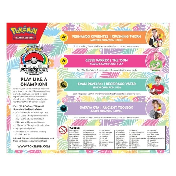 Vier de Pokémon World Championships 2024 in Honolulu, Hawaii met het exclusieve World Champions Deck! Dit deck bevat krachtige Pokémon zoals Iron Thorns ex, Miraidon ex, Roaring Moon en Regidrago VSTAR, rechtstreeks uit de succesvolle strategieën van de beste trainers ter wereld. Ideaal voor verzamelaars en spelers die een uniek stukje Pokémon-geschiedenis willen bemachtigen. Elk deck biedt kaarten uit de populaire Scarlet & Violet-serie, een must-have voor elke fan!